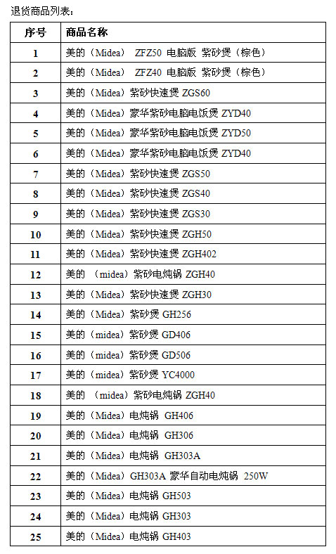 凡在京东商城购买媒体提及的“美的电炖锅、紫砂煲”等相关产品(详见以下商品列表)的消费者,请在线提交退货申请,凭京东购买发票,将发票与商品一同寄回京东公司(在京东提供上门取件服务范围内我们将提供上门取件),京东商城将尽快为您安排退货。同时,您也可以拨打京东客服电话进行具体咨询。或者与咨询美的客服热线4008899316。退货标准: