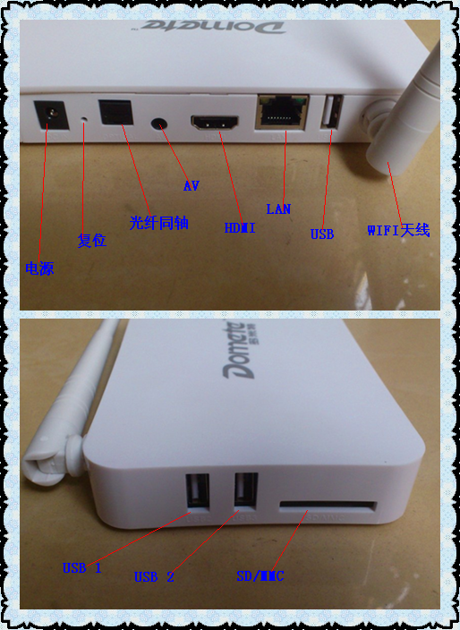 产品的一侧端口为:2个USB,SD/MMC接口,另一侧没有接口。很可惜盒子没有设开关键,而电源的播口又比较紧。