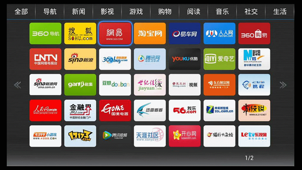 开机时间约1分钟左右,开机后就进入主界面了,最上面是时间,然后上方是:电视直播;视频点播;游戏;商城;网络;教育共六大分类,分类之间的切换采用了翻牌动画,各分类都可以自定义程式。下方是资讯;程序列表;音乐;交互;天气;社交;文件管理;网络;工具;帮助,共十项。