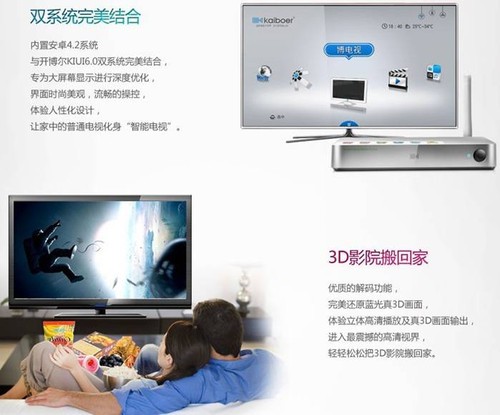 开博尔Q1拥有强大的直播功能,可以用来看多到您想不到的电视频道,让电视成为叹为观止的在线视频播放器;同样,Q1对于离线视频的支持表现出色,就算蓝光3D源文件也能流畅播放,佩戴3D眼镜,让您身临其境体验精彩世界,可还记得,《阿凡达》当年给到所有电影爱好者的震撼和美丽?