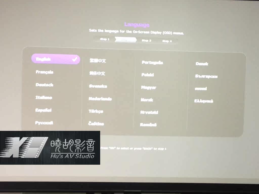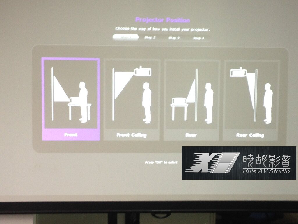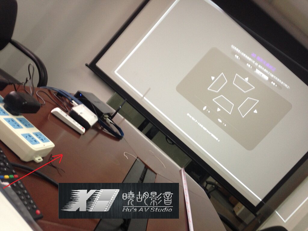 这次明基主要升级了 菜单界面,更加人性化,比较适合初次入手的 玩家! 分4个步骤:选投影模式,选语言,梯形校正,和选输入端口(hdmi1)别忘了选! 现在 来测试一下这次明基w1075 新增加的 水平梯形校正功能。水平梯形位移功能主要是在以下情况下需要用到:正投时候 不能保证镜头正对幕布左右中轴线,还有就是吊装完成的时候发觉位置没量准,镜头没有正对幕布左右中轴线。 如图所示:一般正确的投影方式是 镜头正对幕布左右中轴线,画面就是正的 现在我把投影机 往左移动大概50cm左右,和原来投影方向大概成30度角(w1075 官方宣称的 最大偏离角度),画面就成了这个样子,(红线是 现在投影光线的方向,白色卷尺是刚刚正对时候的 光线方向) 然后调水平梯形 到 大概 -13,就能回到正的长方形,就是画面小了不少,可以把机器往后移动,或者调变焦来搞定。
