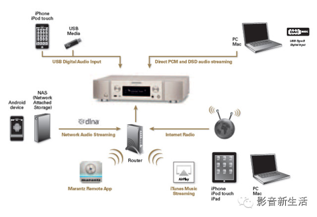 ▌ 完全针对PC Hi-Fi用户而设计 NA8005可以使用ASIO(音频流输入/输出)驱动执行原生播放,使用DoP开放标准(Method for transferring DSD Audio over PCM Frames)传输PC发出的DSD信号。NA8005可以处理高达192kH/24bit的PCM信号。拥有控制音频传输速率的异步模式,使用装置内置时钟而无需与不稳定的PC内置时钟同步。为了提升声音播放品质,和减少与PC连接是的干扰,NA8005可以执行无抖动音频信号传输,而不受计算机时钟抖动的影响。 通过网络连接,可以访问NAS或个人PC,享受海量的音乐资源播放体验 NA8005除了高品质的DAC模块,还拥有带有高品质耳机音频输出部件,可以轻松变身成为一款顶级的耳机放大器使用。此外,NA8005还提供AirPlay功能,能从您的iDevice或iTunes进行直接音乐串流播放,前置USB接口兼容iPod数字音频,可以边充电边播放音乐。 NA8005、SA8005与PM8005都是今年Marantz的最新力作