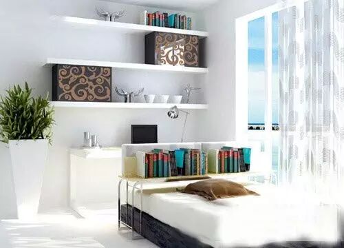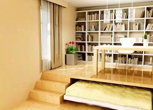 8、地台与床 家中书房除了白天看书工作,夜晚常常还兼具客房的作用。可是摆放一张大床在书房似乎也不太合适,不如把地面抬高,把大床藏在地台下面,小小的踏步之上,地面依然是地面,当你需要的时候,大床就像变魔术般从下面滑出,可以当作沙发,也可以当作临时的卧床。 9、书桌餐桌共用 如果空间有限,不妨考虑用家具的多功能使用方式来增加面积,比如这款长桌,位置在客厅和厨房之间,可做餐桌和书桌两用,既具备分时使用的功能,也可满足不同空间的使用需求。 10、电脑椅和沙发 需要办公的时候,滑柜床往电脑桌前推动,就代替了电脑椅,需要看电视的时候,把靠垫放到背后就是沙发。为家具安装滑轮,这是增加它的功能的有效方法。小件家具安装滑轮之后,就可以自由组合推动,衍生出更多的功能。 11、可抽拉的搁板 就像电脑桌下的键盘托,这款可抽拉的搁板既可以隐藏在床下,也可以变身为宽敞的电脑桌。这是非常节省空间的使用方法,如果你使用手提电脑,只需要把盖子盖上就可以推进去。如果需要,这种搁板同样可以当作餐桌使用。图文来自网络。