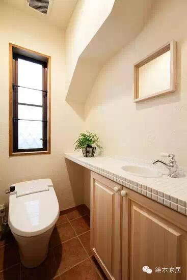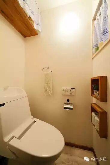 07. 装饰色彩清新淡雅,尽显自然之美。木板打造的凹陷处,摆放上手纸和盆栽,不仅方便拿取,而且上下两层的样式,给人一种活泼可爱的动感。淡蓝色的小布帘,遮住了两侧的收纳空间,可以避免沾染灰尘,淳朴的日式风吹满每一个角落。