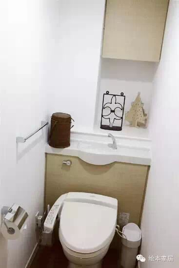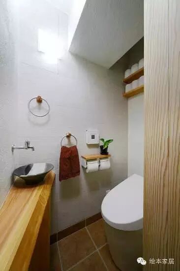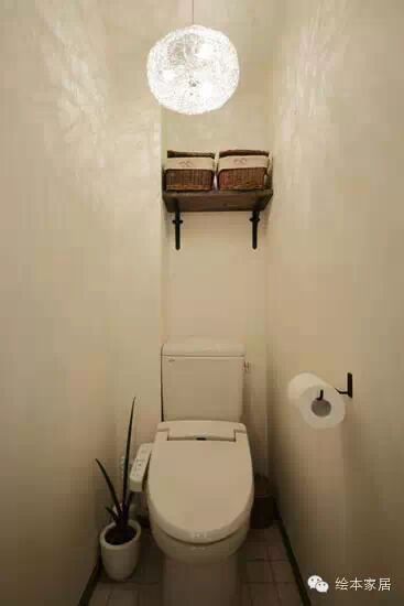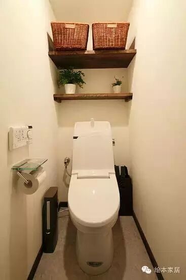 02. 实用性强。1平米不到的空间里既保证厕所功能又不忘安排收纳区——马桶上方用木板做隔板,摆放上竹制手工编织的小篮子,让迷你卫生间也有超强的收纳功能,还摆放些许绿植做装饰。