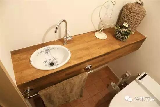 09. 使用木色为主色彩,让小空间暖意十足又不乏清新淡雅。长条形洗手台搭配碗形台盆,实用又有设计感,后墙的隔板又增加了一方收纳之地。