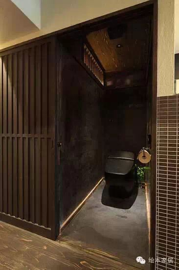 10. 黑色的卫生间比较少见。绿色的小植物,不仅给暗色的空间增添了一抹亮色,还净化了空气,一举两得。大胆的色彩,也给古朴的装饰增添了不一样的韵味。