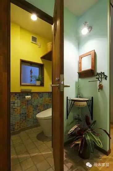 03. 空间不大,巧用色彩取胜!柠檬黄和多色马赛克让小卫生间妙趣横生,别有一番韵味。小窗口的设置也让小空间小而不暗,受空间所限,洗手台放在门外的墙角处,隔出了干湿分离。用淡蓝色的墙壁,色彩的跳跃更给人耳目一新的感觉。