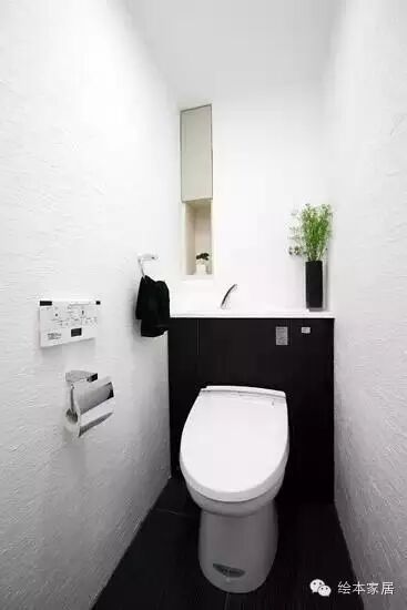 12. 经典黑白色调的使用让这个小空间立即格调升级,装饰以绿植更添几分清新,黑白绿构成的小空间,虽不到1平米,但是却毫无空间压迫感,冷色调的色彩搭配值得借鉴。