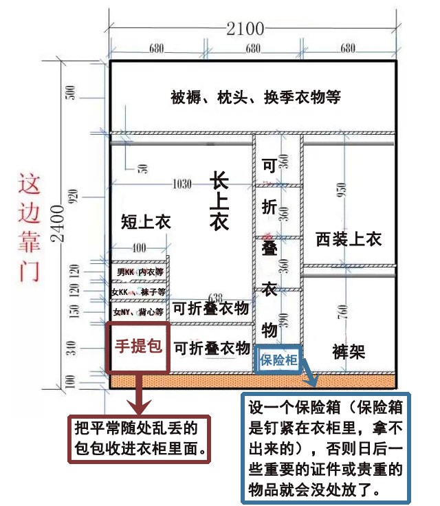 设计衣柜首先要想到需求。如图业主就根据需求在衣柜里专门留了放包包以及放保险箱的位子(保险箱到时是钉紧在衣柜里面的)。