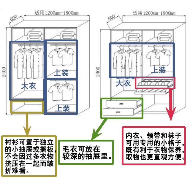 衣柜整体布局小贴士1[size=1em]棉被层隔板设置要窄