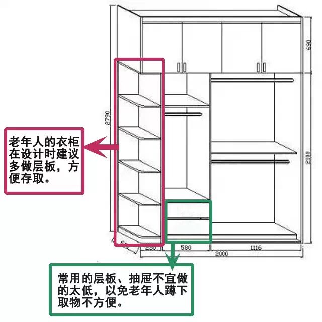 由于老人衣物也不会很多,衣柜不需要特别大,但一定要注意存取方便。