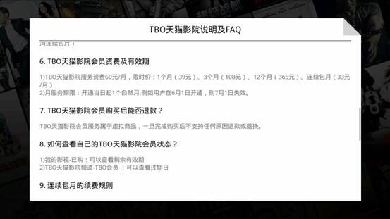 从开博尔主界面【推荐】栏点击下方【TBO天猫影院】或者【影视】进入观影区,整个TBO影院完整的呈现在我们面前。左上角为TBO天猫影院LOGO,右上角为会员、我的影视和影片搜索区,左侧为TBO全网独播好莱坞娱乐剧《比弗利山富二代》,中部为全部影片、独播大片、E!Zone好莱坞娱乐直通车、阿里出品,右侧为会员权利介绍和相关节目预告内容。 从整个界面上看,TBO简洁干净,没有任何多余的UI和引导页,一对一的层次关系可以让用户快速查找到自己想看的内容。在右上角的《我的影视》里我们可以看到以往的观看记录和会员服务购买情况。 (TBO天猫影院主界面左侧) (TBO天猫影院主界面中部) (TBO天猫影院主界面右侧) 内容背景实力雄厚 全球资源一网打尽 外界消息显示Alibaba集团联合全球众多影视业大佬重金打造TBO天猫影院内容资源,其已与环球、索尼、派拉蒙、狮门等好莱坞电影公司签署了长期的战略合作协议,对方将为其提供大量独家包月影片及最新最热的点播新片。 除了与外部的影视公司的合作外,包括阿里影业、阿里数娱原创部门、优酷土豆等阿里内部产业以及投资的光线影业、华谊影业等公司孵化的优质内容也在为TBO天猫影院夯实内容基础。然而与这些国际影业公司的合作还仅仅只是开始,未来包括美剧在内的更多内容也将被引进。对照当前国内的优质资源匮乏、陈汁乏味的现状,TBO的全球影视资源扩充着实令人兴奋。 目前从小编实测来看,美国娱乐频道E!ZONE已经在TBO独播,优酷等资源也已经接入TBO了。E!频道是环球旗下唯一以好莱坞流行娱乐文化为主轴的电视频道,内容涵盖娱乐资讯、时尚、潮流、脱口秀、真人秀、名人档案、直播活动等多个领域,服务全球超过1.12亿用户。在国内,E!ZONE频道的《与卡戴珊同行》也拥有无数拥趸粉丝。此外,背倚环球资源,TBO娱乐资讯节目将每日送上最新新闻。 (E!频道现已全面上线,在TBO天猫首页位置露出,同步更新美剧狂大爱) 院线大片同步更新 独播资源库极其庞大 由于阿里与狮门、Discovery、光线、华谊等国内外一线皆属内容提供商的关系,TBO 天猫影院里的电影整体质量较其他视频网站自然更高,拥有高达数千部独家播放的国内外大片。尤为值得一提的是,TBO里内含大量支持DTS-HD的优质影片,即使是对音质和画质要求苛刻的高端影音发烧友估计也会感到非常满意。另外,TBO天猫影院在院线新片的上架速度之快令人意外,众多最新影院大片也都悉数上线,单就这点必须加分。 每天只花1元钱看遍TBO 聊完了影视内容资源,很多人自然会考虑费用的问题。现在开博尔用户除了免费获得的5天观影特权外,另一重利好就是TBO现在处于推广折扣期,每月费用为 39 元,还有一个 33 元/月的限时抢购价格;108 元/3 个月;365 元/一年,如果直接包年的话,约合每天 1 块钱。同时,如果订阅 TBO 的话,用户还会根据所订阅的时长不同,获得不同数量的天猫影院单付费点播大片的观影券。现在买买买,送送送,相当实惠! 更多精彩,不妨即刻登陆开博尔网络播放器(YUNOS系统机型)体验。