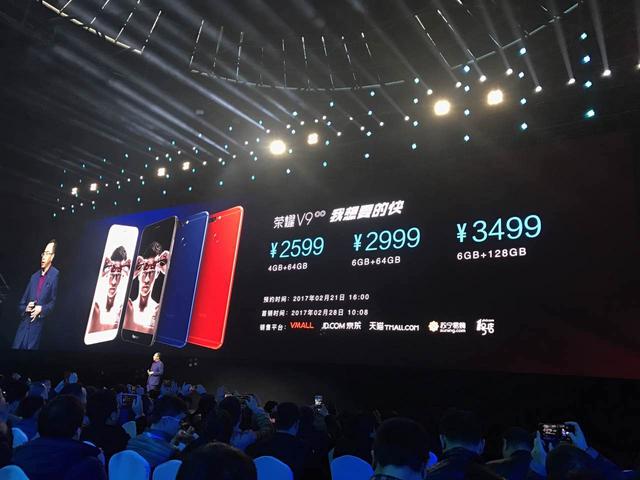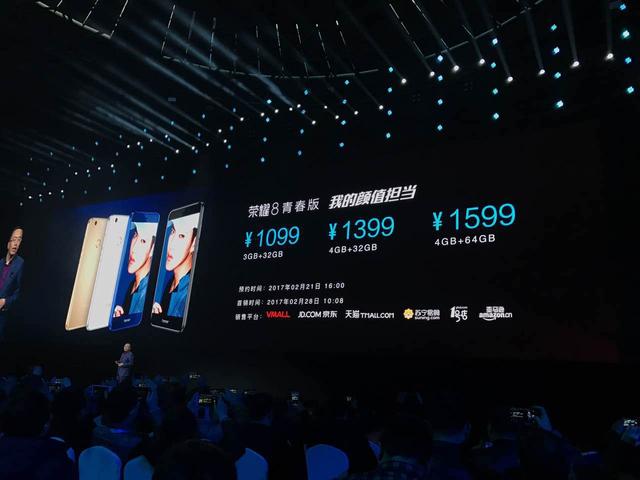 价格方面,荣耀V9售价2599元起,最高配6+128GB版售价3499元。荣耀8青春版三个配置分别售价1099、1399、1599元,2月28日同时上市。