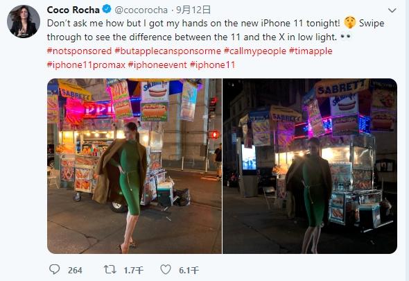 除了A13处理器之外,iPhone 11最大的进步就是摄像头了。 据了解,iPhone 11 Pro系列后置的三颗摄像头均为1200万像素,其中左上角的是广角镜头,等效焦距26mm,光圈F1.8,六片式镜头,OIS光学防抖; 左下角的是长焦镜头,等效焦距52mm,光圈F2.0,六片式镜头,OIS光学防抖; 右侧的是超广角镜头,等效焦距13mm,光圈F2.4,五片式镜头,视场120度。 iPhone 11 Pro不仅升级了三摄,还增加了Night(夜间)模式。当手机处于低光环境下,会自动开启(可关闭),同时依靠广角、超广角镜头,将连续拍摄的多张照片同时提供给A13处理器进行分析,优化、降噪,最终合成一张最佳照片。 大家知道iPhone XS系列的晚上拍照一抹黑,和拥有夜景模式的国产相比没法看,那iPhone 11的夜晚拍照最终效果如何呢?不看广告,看疗效。 日前,国际超模Coco Rocha(可可·罗洽)在社交媒体上晒出了iPhone 11 Pro Max的夜晚实拍样张,并同场景和iPhone X进行了对比。 “别问我怎么拿到的,今晚我已经上手了全新的iPhone 11系列。看看和iPhone X低光拍照的差别吧!” 从对比图来看,iPhone 11 Pro Max的夜晚样张明显比iPhone X好了不止一个等级,亮度大大提升,同时拥有出色的白平衡、对比度和细节表现。 当然,在正式发售之前,媒体的评测尚未接近,9月20日之后一起来看看吧。