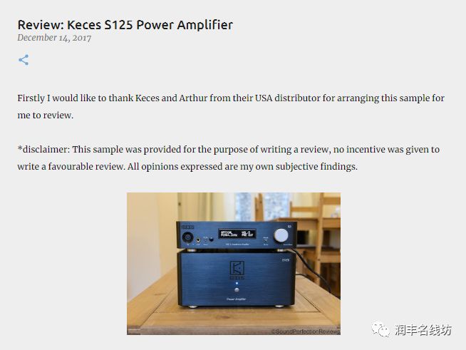 原标题:Review: Keces S125 Power Amplifier 原文链接: http://www.soundperfectionreviews.com/2017/12/review-keces-s125-power-amplifier.html?spref=fb&m=1 首先我要感谢KECES和他们的美国分销商Arthur安排这个样机提供测试。 *免责声明:本样机是为了撰写测评而提供的,没有给予奖励写一个有利的评论。所表达的意见均为作者自己的主观发现。 技术规格: 功率输出 - 125W x2 @ 8ohm / 225W x2 @ 4ohm 桥接单声道 - 360W x1 @ 8ohm 功率带宽 - 5Hz - 100kHz 电流容量 - 每通道30A峰值 总谐波失真(THD + N) -<0.004% at 1kHz A-计权 信噪比 - 113dB 20Hz-20kHz 输入灵敏度 - 1V 输入阻抗 - 38k欧姆。 交流输入电压 - 110V-120V,60Hz / 220V-240V,50Hz(可切换) 功耗 - 500瓦 尺寸(WxDxH) - 300x220x133mm 重量 - 12KG 建议零售价 - 999.95美元 包装,质量和配件: S125由一个大棕色卡箱装着,重型货物在运输过程中可以保护设备。内部的功放用纸板紧紧固定,包装非常好。这个盒子没有什么特别之处,外部也没有什么数据,不过里面的东西才是最重要的。 S125和Keces的其他产品一样,是牢固的。外部机箱采用纯铝,他们或许不是最特殊的单元,但是它们能够很好地工作,减少电子干扰,并保持组件内部的安全。接线柱厚实,接受普通的香蕉插头;输入紧凑,质量非常高,电源开关很简单,但工作得很好。Keces似乎不担心设备看起来很花哨,他们专注于内部电路,反正我更喜欢更实用的外观。功放的输出功率也很小,顶部有散热孔,不会太热(由于A/AB级的操作,它会变热)。 配件明智的,你得到的是一个电源线,并不需要别的东西。如果你已经有了一个合适的前级,我使用的是KECES S3,它放在S125上面看起来非常漂亮。 每个通道具有独立二次绕组的1 kVA封装环形变压器。 甲乙类操作。 RCA、XLR两种输入端口,独立切换开关。 40,000μF电源滤波电容。 直流伺服电路。 过载/过温保护。 镀金RCA输入插孔和重型24k镀金扬声器接线柱。 铝质机箱的4mm厚度能够有效阻挡EMI / RFI干扰。 全金属机身在A4尺寸的身上实现了振动控制和优雅的风格,可以在桌面上放置成PC HIFI系统或成为小型立体声系统。 Keces以其电源而闻名,主环形变压器是S125交流电路中提供非常干净的电源的关键元件。 如果您有2个,它可以作为2声道功率放大器使用,或者在桥接模式下作为单声道模式使用。S125具有大部分标准立体声设置的功率。 首先,这个设备在使用时非常安静,即使有敏感的扬声器也不会出现嘶嘶声,设备也有继电器,这样就没有电源开关了。 S125紧随S3的脚步,拥有非常轻松动感的音质。这似乎是KECES家的声音,而我个人非常欣赏的一点,S125是非常中性的。声音非常干净,细节非常好,中音开放、细腻,但从不失去动态性和音乐性。 大多数人将音乐与色彩联系在一起,S125让你感受到音乐的乐趣,而没有其他功放的强烈色彩。 S125不是一个豪华的功放,它快速而干净,专业地为您的扬声器提供非常干净的声音,而不会突出显示频谱的任何部分。低音打得很深,而且精确度也很高,中音非常开阔,高音毫不费力。S125具有出色的分离和空气感,声场宽而且毫不费力。 S125的一大优点是可以使用系统的其余部分来调节声音,而且对整个系统的着色很少。如果你想要一个非常干净的音响设备,S3 + S125的系统是非常好的。你可以使用一个前级来得到温暖的声音,或者如果你想要那个声音的话,可以用一些更全面的扬声器来搭配。S125像S3一样尽量避开,让你享受音乐,而不是设备。 另一方面,如果在平衡模式下使用,你可以用S125和低端耳机,我做了一个喇叭转4针平衡信号线使用S125与HifiMan HE-6,HE-500和MrSpeakers Ether Flow。Ether Flow有一些背景噪音,但这是由于耳机的灵敏度高;HE-500只有最轻微的背景噪音,并不是一个问题,与S125一起使用,当音乐播放时,他们听起来非常动态和冲击当。HE-6没有背景噪音,用S125使用它是我所听过的最好的,低音是无底的,强大而不霸道,其余的声音分离的非常详细,是我曾经听过的最好的一个耳机。 结论: 使用S125,您可以获得一个功能强大的功放,可以处理大部分扬声器。我最喜欢的是S125不会试图用鲜明的特征吸引你的注意力,它排除了音乐的方式,并提供了一个强劲动态的声音,从低音到高音也是完美平衡的。使用Keces的设备,用一个词来形容是毫不费力;他们的设备从来没有任何紧张或压缩的动力的迹象。音乐轻松流畅,我发现自己只是更喜欢音乐,更少分析设备了。 完美的声音评级:10/10(做它所做的轻松和出色的音质) ★ 注:机翻+人工整理,文章如有不通顺处请自行翻译 |