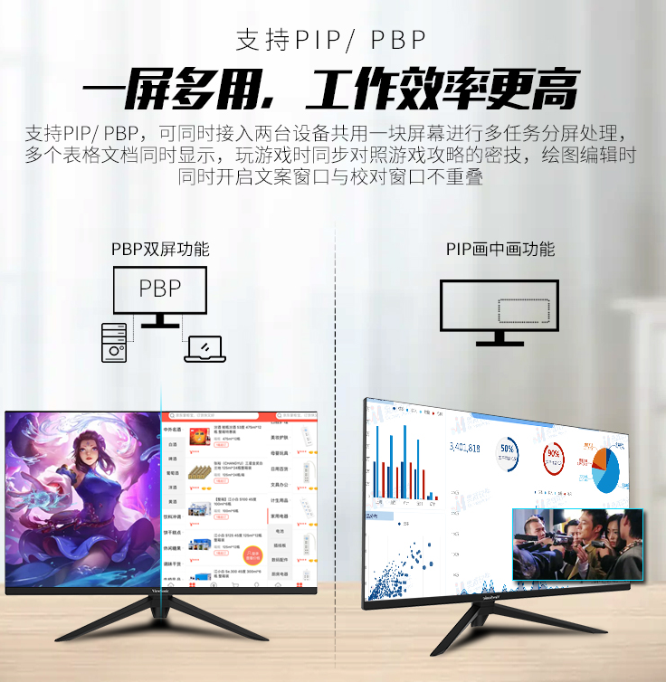 专业与贴心打造双重满足 VX2880-4K-PRO和VX3220-4K-PRO支持PIP和 PBP分屏,多个输入源同屏瞬时提升工作效率,PBP双屏功能,同屏双信号源输入,避免传统显示器边框拼接,而PIP画中画功能,可调节副信号源窗口分辨率及摆放位置,除了满足专业电竞玩家日常游戏需求之外,也能很好地满足其他领域的不同场景的需求;支持Type-C PD65W快充充电,利用USB TypeC接口,由一根线实现2K画面数据传输、笔记本供电等功能,最大功率可达到65W;配有升降旋转底座,快拆支架,支持四个方向调节 (上下升降/左右旋转/前后倾仰/垂直旋转) 以及壁挂,为用户提供舒适的娱乐体验。