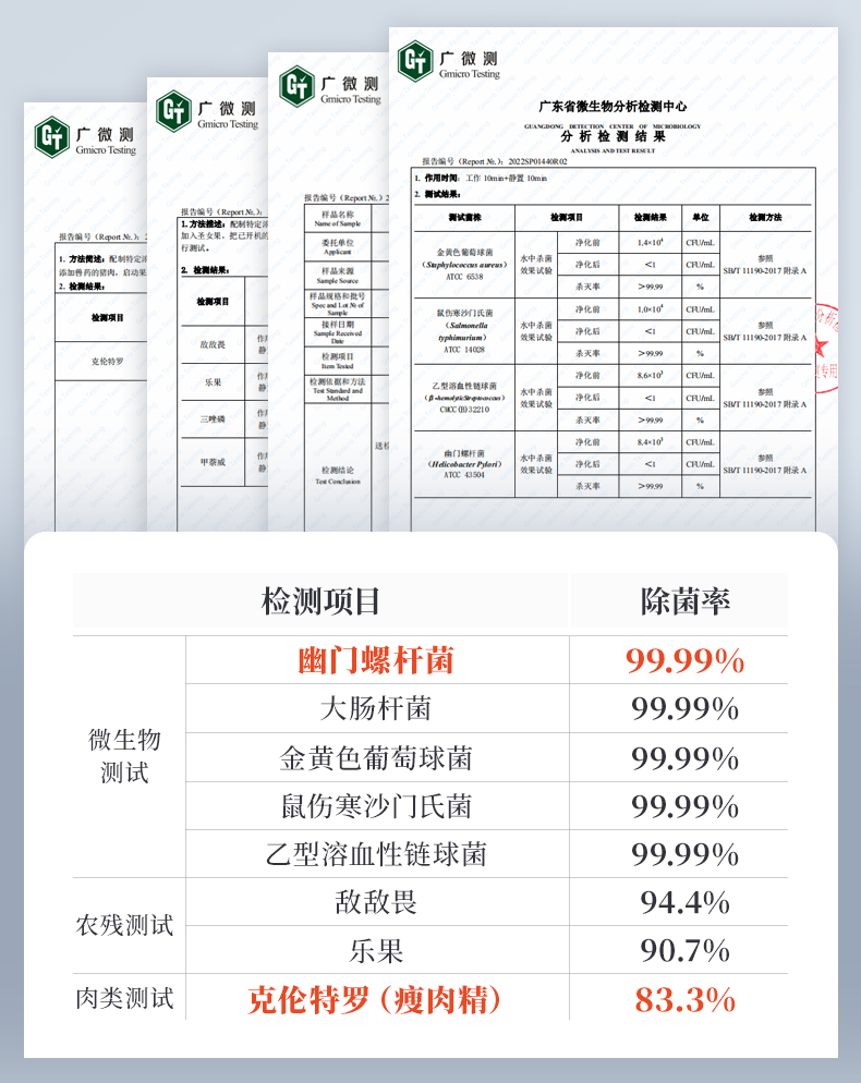 [1]数据来自广东省微生物分析检测中心 满足多类食材净化,果蔬肉类放心吃 东菱分类果蔬净化器除了能轻松应对果蔬、肉类、海鲜、五谷等各类食材,还可以自制消毒水,净化日常使用的餐具,围堵有害细菌,更有权威机构认证,实力去除99.99%的幽门螺杆菌[1]。值得一提的是,经过净化后,食材不易滋生细菌,保鲜期更长,更利于科学处理备餐。瓜果蔬菜连皮敞开吃,爽脆沙拉生食也安心;减少瘦肉精等激素,吃上放心肉;肥美生鲜深层净化,享受食物新鲜的原滋味。 [1]数据来自广东省微生物分析检测中心