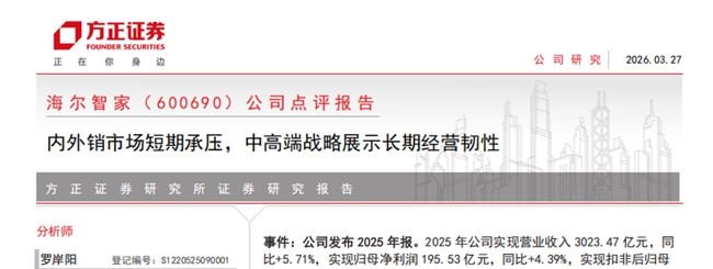 近日,海尔智家发布2025年报,全年实现营业收入3023.47 亿元,同比增长 5.71%;归母净利润195.53亿元,同比增长4.39%。方正证券指出,在内外销市场承压的背景下,海尔智家全年业绩依旧保持稳健增长,展现出长期经营韧性。 方正证券分析,2025年海尔智家业绩阶段性承压主要受外部环境影响。国内市场受家电补贴政策退坡、行业竞争加剧拖累;海外市场则面临北美需求疲软、关税成本上升等压力,叠加原材料价格波动,对盈利端形成一定影响。 但从长期竞争力来看,海尔智家高端化、全球化、数字化等战略成效显著。2025年卡萨帝品牌收入同比双位数增长;美国市场连续4年位居行业第一,其中高端品牌收入同比增长7%;CCR业务实现收入双位数增长,亚太地区收入同比增长16%。 方正证券认为,随着内外市场逐步回暖,海尔智家有望凭借高端化引领与全球化优势,实现持续高质量增长。