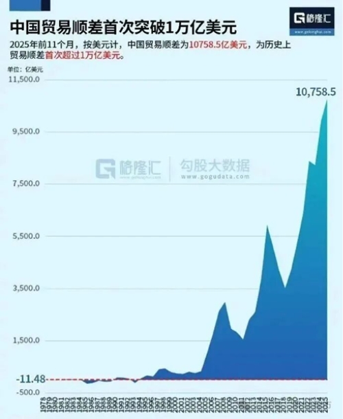 其三,关税政策的持续影响进一步凸显。美国此前已将钢铝及钢铝衍生品关税从25%上调至50%,该政策覆盖多种家电核心零部件及成品,直接压缩了海尔智家北美业务的利润空间。加之美国市场在其整体营收中占比偏高,这也成为拖累公司一季度整体业绩的重要因素。 值得注意的是,这种承压具有明显的区域性和临时性。剔除北美市场后,海尔智家Q1经营利润合计增长10%以上。这充分说明企业核心经营能力未受影响,业绩承压仅为短期外部因素导致。 总的来看,海尔智家海外市场表现仍是可圈可点的。北美市场,GE Appliances稳居美国大家电份额第一;欧洲市场,海尔智家白电品牌整体份额位列中国企业首位;东南亚市场,越南、泰国等核心国家销量稳居第一;澳新市场,海尔和斐雪派克双品牌大白电第一。 同时,海尔智家在全球范围内推进AI与数字化变革,2026Q1销售费率再优化1pct,为后续发展筑牢根基。 长期看: 全球化布局,契合中国制造业禀赋 短期业绩看周期修复,长期增长看战略定力。海尔智家的全球化,从来不是简单的“产品出海”,而是深度契合中国制造业优势的必然选择。 为什么中国能成为全球制造大国?答案藏在不可复制的禀赋里:规模最大的工程师群体、全球最完善的供应链、领先的生产效率,还有成熟的产业集群效应。 海关总署数据显示,2025年中国贸易顺差突破一万亿美元,即便历经中美贸易摩擦,制造业出海势头依然强劲,这正是中国制造业硬实力的最好证明。 图:中国贸易顺差突破一万亿美元