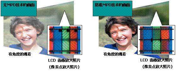 像素精细化技术 (MPD)通过将组成像素单元的红、绿、蓝三基色划分成更小的区域来控制颜色层次. 这样可以使水品或垂直的观看角度得到很大提升. 当从一个角度观看所示画面时,甚至孩子的肤色依旧可以通过明丽的色彩被自然的还原.