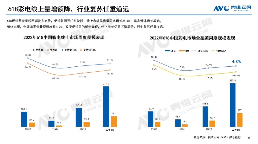 奥维云网发布618彩电总结报告。今年各大电商平台都拿出比往年更大的优惠力度,加上近期电视面板价格狂跌,618期间彩电线上销量增长11.2%达到277万台,线上线下全渠道销量增长4%达到337.4万台。