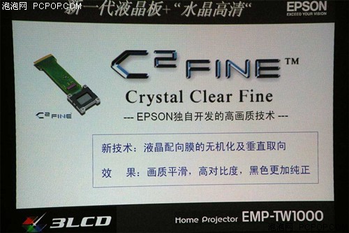 EMP-TW1000采用了爱普生第七代液晶投影板,也是最新的Crystal Clear Fine(C2Fine)技术,它以VA(Vertical Alignment,垂直取向/垂直配向)广视角液晶和无机配向膜为基础,结合高温多晶硅(High Temperature Poly-Silicon,HTPS)以及能够以60Hz频率控制灯泡亮度的动态Iris光学系统,在0.74英寸的液晶薄板上实现了1920×1080的全高清分辨率和12000:1的超高对比度,并且弱化配向膜的格栅现象,使得高清晰的画面呈现出丝绸般柔和的过渡效果。