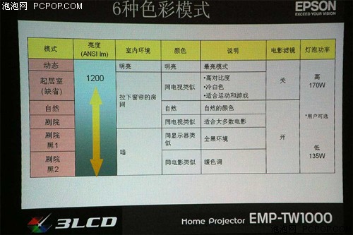此外,爱普生最新研发成功的Miami & LB-UG镜头赋予了EMP-TW1000高达2.1倍的变焦比,并且具备高解像能力和低闪光等特性。来自Pixelworks公司的PW328图形处理芯片提供了10bit灰阶处理能力,使得EMP-TW1000全程采用10bit信号处理,红、绿、蓝三原色分别提供1024级灰阶,从而达到10.7亿种色彩的表现力,再配合10bit驱动的VA液晶板和能够提供NTSC比值115%广色域的爱普生“电影滤镜”,毫不夸张地说,EMP-TW1000的色彩表现力已经超越了目前其他主流显示设备所能达到的水平。此外,PW328还支持真正的1080i/p转换、3D亮色(Y/C)分离以及3D降噪处理,能够对各种格式输入的信号进行净化和增益,从而提高画面表现力。