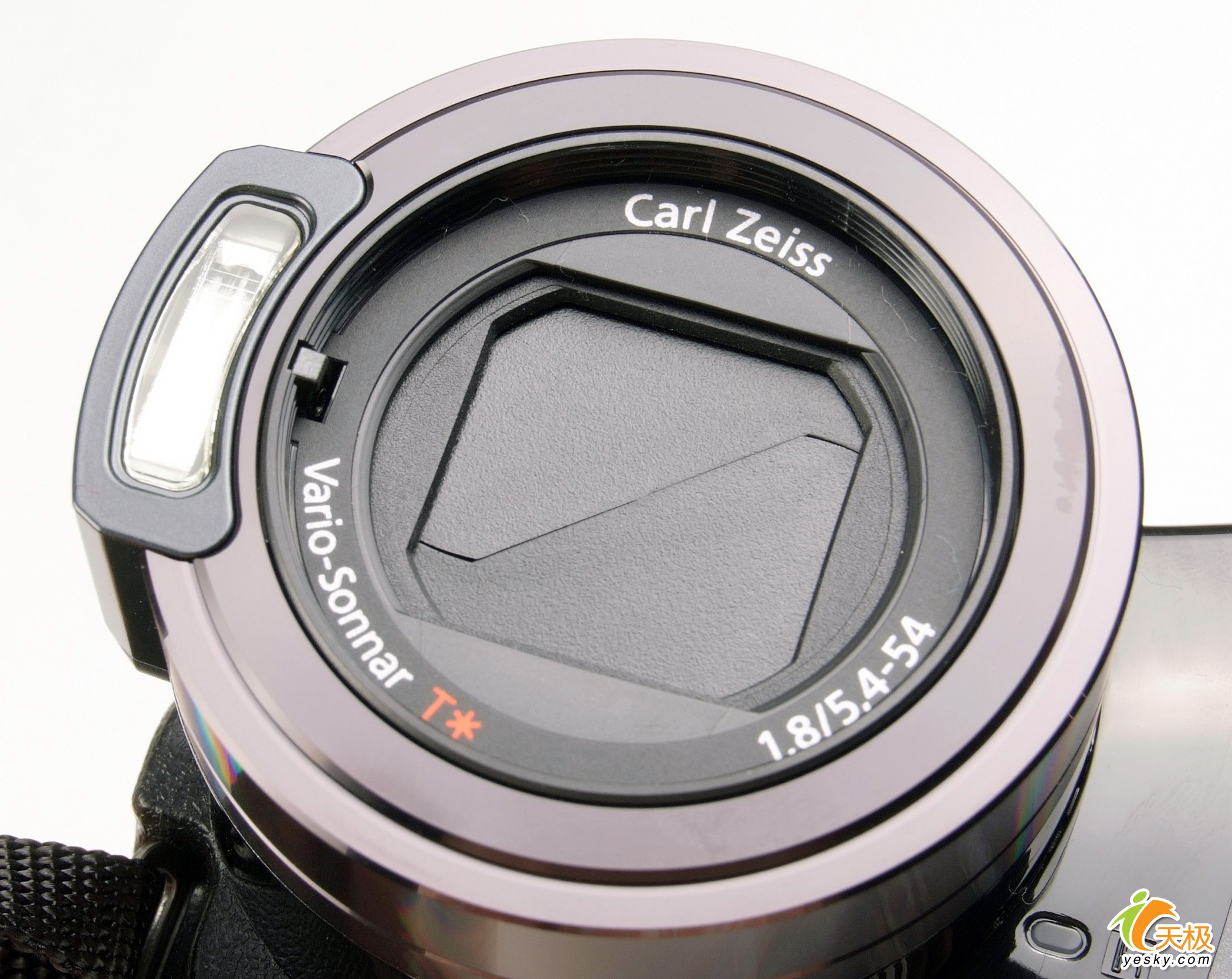 卡尔蔡司的Vario-Sonnar T*镜头 这颗镜头的良好表现已经在HC7上得到了证明,同样支持镜头的光学防抖。在控制了机身体积的情况下,镜头没有设计手动变焦环,但是在今天外围突出的位置包裹了一层金属材质,有效得增强了机器的坚固度。在镜头的左边是闪光灯,右边是遥控红外感应。