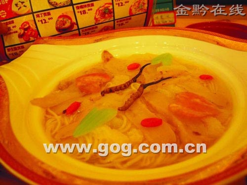 陈经理称,这碗面的主要材料有手工精心制作的面条,两棵虫草,还有天麻等,配以土鸡煲汤,以保证鲜味。尤其是药用价值很高的虫草,算下来每棵价值50元,所有这些材料的成本在100元以上。