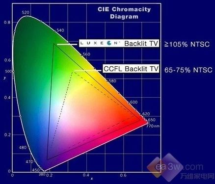 LED电视色域示意图 CCFL (冷阴极灯管) 背光源是激发荧光粉发光的,其发光光谱中杂余成分较多,色纯度低,导致其色域小,通常只有NTSC的70 %左右。而LED的发光光谱窄,色纯度好,用三基色LED混光的背光源具有很大的色域和优秀的色彩还原性,通过选择合适三基色,可以达到NTSC 的105 %以上,比传统CCFL背光源的色域扩展了大约50 %。