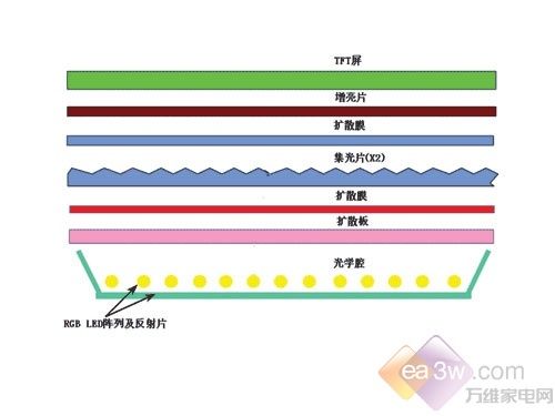直下式LED背光示意图 直下式背光源的厚度由灯箱底部和散射板的距离决定,通常厚度越厚,背光源的光均匀性就越好。在背光源较薄的情况下,色彩和亮度均匀性就成了直下式背光源的技术关键。
