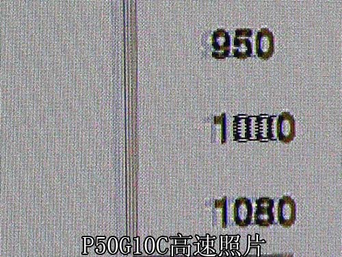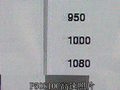 上述两张照片都是在高速拍摄下得到的动态清晰度测试照片,在开启“智能场频”选项之后,两者都能实现1080线的水平清晰度,尽管此时图像看上去不那么精细,那为何非要独立设置一个开关?显然这种变频技术也多少有些针对测试图像的优化功能,利弊何存尚难确定,多少能感觉图像有些瑕疵,G10C与S10C半斤八两而已,当然笔者并不否认新系列的等离子在动态水平上有较大的提升,更是比液晶显示强出许多。