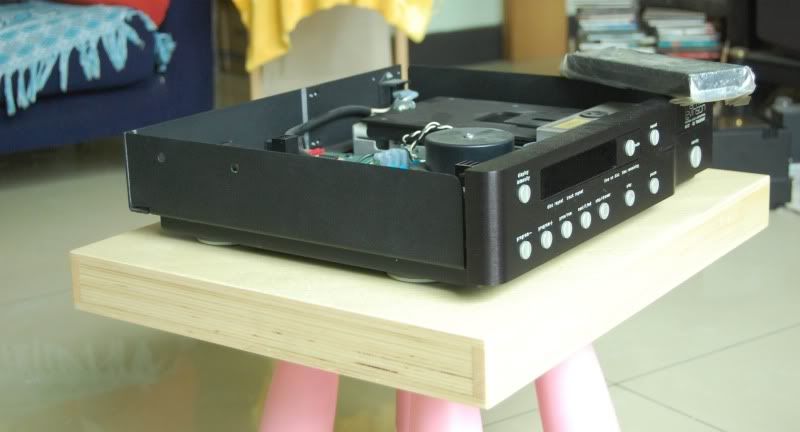 设计上Stable-1可能真的令用家感觉有点烦恼,锺一要先把两旁承放在GM架上的器材尽量向外移,幸而尚可把Stable-1容下来。至於底下四粒胶脚的落点(500mmx290mm),就不能直接放於Corian板上,而是在层架的『外框』位置,放心,用掌心大力按下去,再向左右前後推动,仍觉非常稳阵。