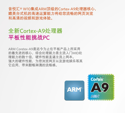 音悦汇W10采用了最新的ARM Cortex-A9架构核心,相对目前市场上的产品,A9在同频率下的执行效率更高,Cortex-A9采用了超标量设计,能够单周期执行2条指令,相比同频的ARM11处理器性能还要强数倍。Cortex-A9处理器更改进了流水线,除了增加多处理指令还加入了乱序执行等功能。除了拥有Cortex-A8的特性之外,每核心平均同频性能比Cortex-A8提高了20%。配合512MB DDR2 RAM,无论在系统执行的流畅度或者多任务执行操作和网页浏览方面,都提供了高速和充足的带宽。