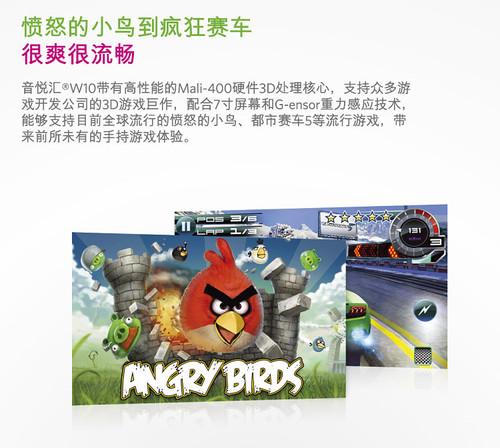 除了Cortex-A9的架构,GPU方面W10还内置强大的Mali-400核心,可以理解为类似电脑显卡上的显卡芯片,同样来自微处理器巨头ARM,提供了等同于PS2或Xbox游戏机的3D处理能力,支持OpenGL ES 1.x/2.0接口,拥有多达4个片段处理引擎。这样可以使得W10拥有足够的性能去处理一些3D的游戏和特效,将W10连接高清液晶电视,外接键盘,运行优质3D游戏,使W10变身一个出色电视游戏机,在蓝魔音悦汇体验会上,数码玩家将W10当作一个游戏机与手柄,运用重力感应控制汽车的场面让人记忆犹新。
