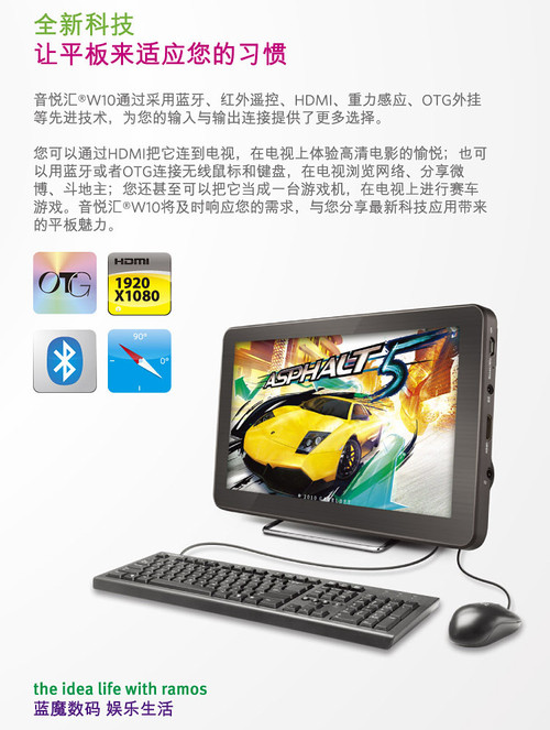 HDMI输出是高清MP4的标准配置,而多数的平板电脑也配备了这一功能,不过,W10的独到之处在于可以全时HDMI输出,即可以将所有的操作展现在液晶电视上,配合鼠标键盘,可以完全脱离W10本身进行操作,真正实现了电脑的概念。