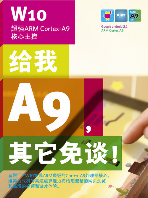 尽管ipad2代发布在即,但国内平板行业依然热闹十足,作为先锋品牌,蓝魔音悦汇的W10可谓吊足了大家的胃口,而就在2月份即将过去的时刻,w10终于正式发售,全面越级的硬件配置,超凡脱俗的性能,更让人惊讶的是999元的超低价位,不仅各大代理处预售火爆,而淘宝上早已提前大卖,究竟W10有着怎样的特色与魔力,让我们来简单分析。 一、给我A9 其他免谈