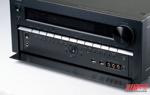 PR-SC5509面板上将大量的插口和按键都隐藏在面板下方的空间内,然后再加一块活动档板遮挡,能让面板看起来更整洁