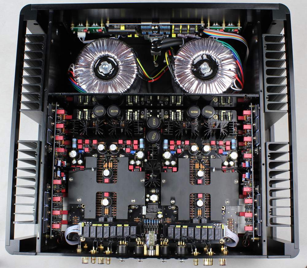 运用强大的高功率器件及电源储备保证输出能驱动绝大多数的音箱。四个通道的无反馈钻石菱形输出级使用24个有“管王”之称的 MJL4281/4302 。滤波电容量高达十四万UF, 两个供电变压器总功率达 1500W.