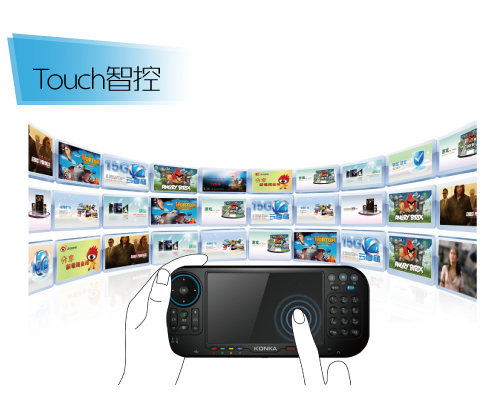 康佳量身打造的“Touch智控”智能遥控器,率先引入手势识别、语音识别、智能操作,彻底打破了50多年的遥控器使用习惯,颠覆传统,业内首创。集传统遥控按键、电脑的无线鼠标、电脑的触摸板、手机的触摸屏、无线麦克风于一身,智控无限精彩,震撼一触即发。