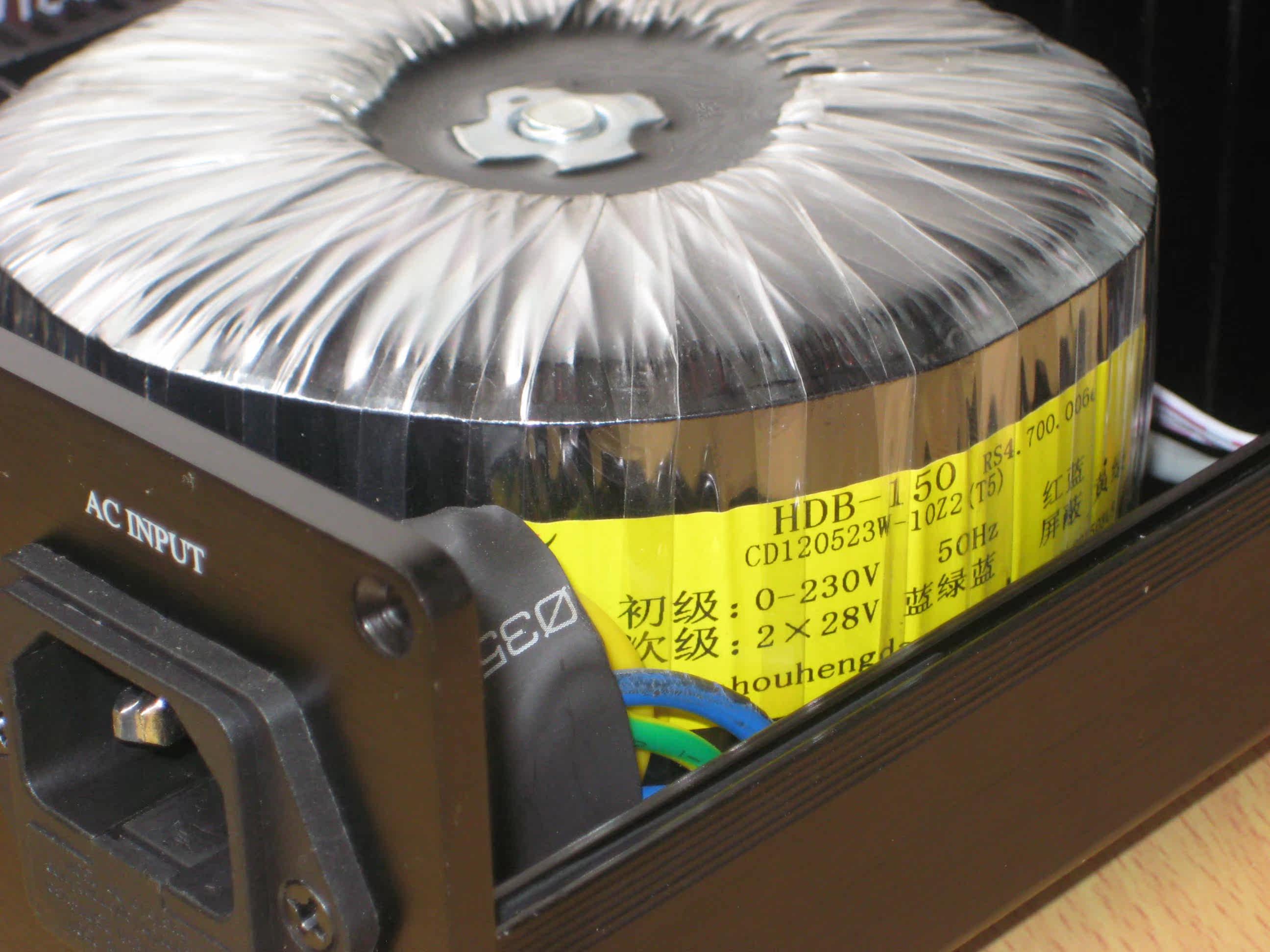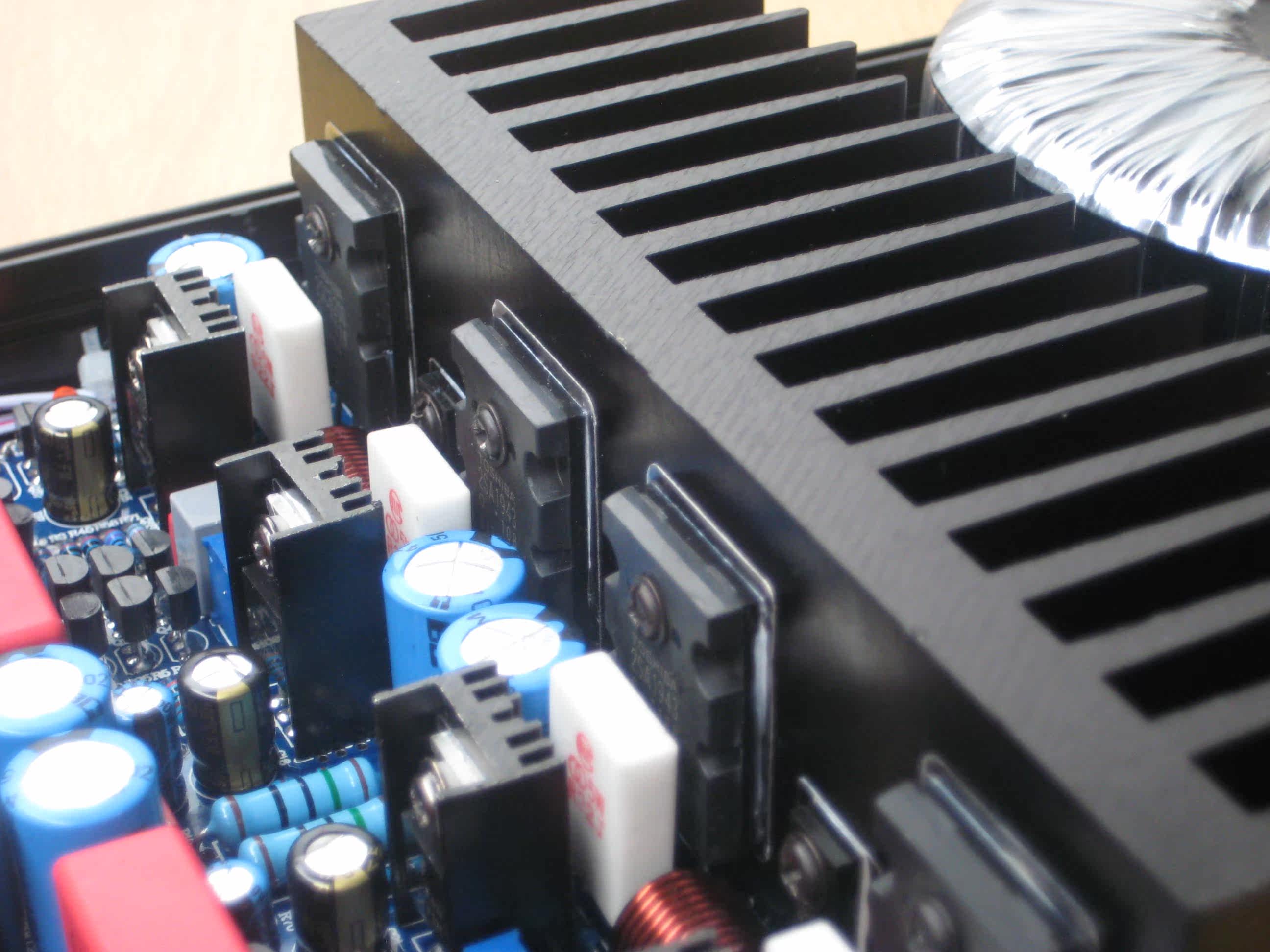 特意量身定制的大散热器,要想机器声音好,那机器就得“发烧”。现在知道业界“发烧友”这个名词是怎么来的了吧。现在网上好多产品为了节约成本而省了散热器,有的光靠底板散热,这种设计理念是不好的。很多名机、名器的散热器大的出乎意料,而且不拘一格,各种造型,不仅精美,而且散热效果很好。在这里散热器除了给大功率管散热外,散热器还起着功放板和变压器隔离作用。因为散热器和底板保证了电气连接,而底板接的是大地,散热器和机壳就形成了一前一后的两个隔离腔体,对整机信噪比提升很大,低频噪声几乎不可闻。 功率管使用东芝原装2SC5200/2SA1943对管,能输出15A电流,玩过HI-FI的人都知道它。