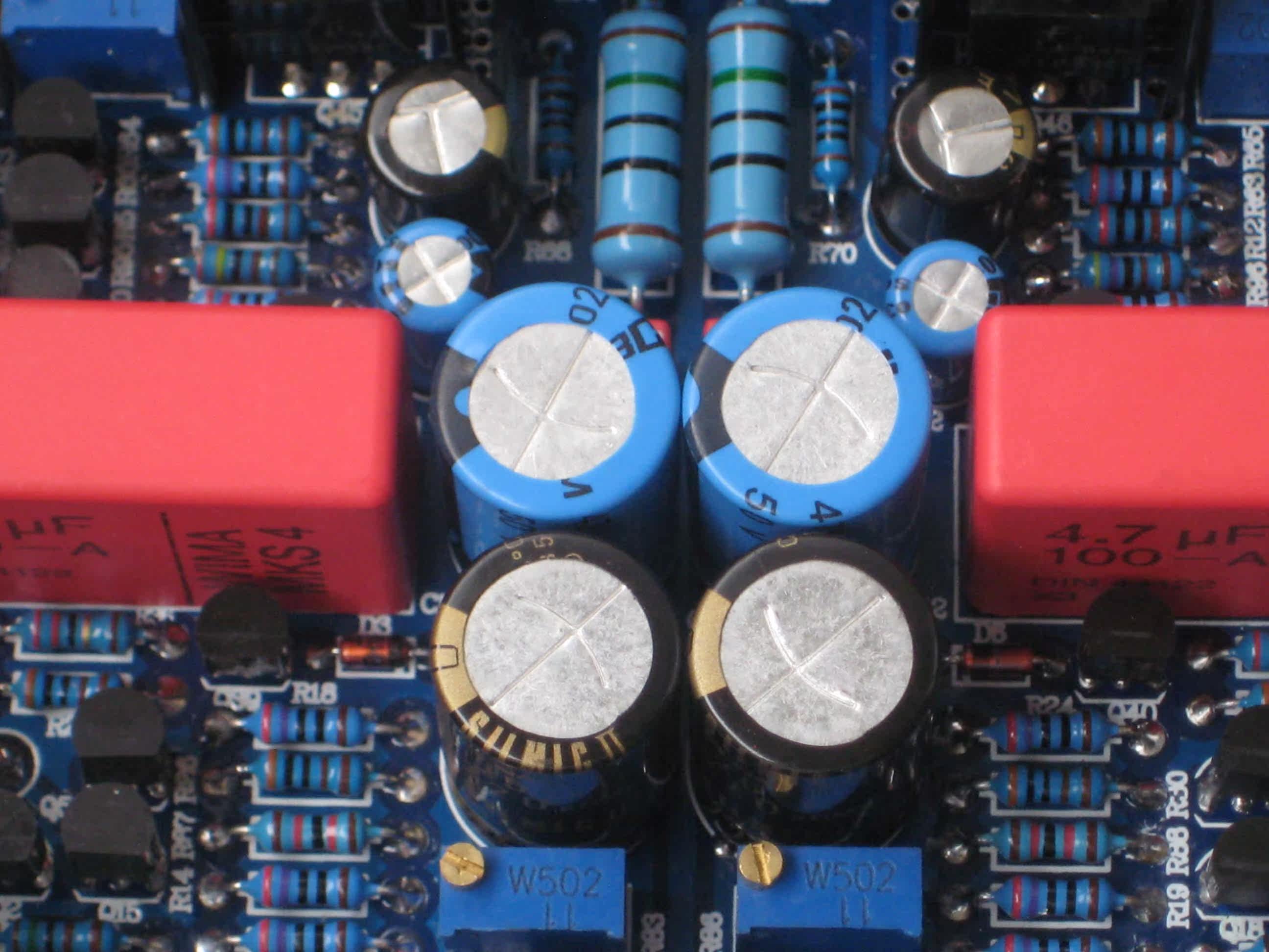 音频耦合电容使用全新4.7uF/100V/MKS4威马WIMA补品薄膜电容,有红色仙丹的称号。德国威马 WIMA 生产的红色 MKS4 金属化聚酯材质,真空镀铝膜技术生产的高性能无感结构薄膜电容。是WIMA系列电容中常用的一款,高电压电压电容比,正切角损耗小,声音中性,比MKP声音温暖,音乐感强。 两只精密可调电位器可将前级中点直流电压调零,保证了互补对称电路工作的平衡。飞利浦PHILIPS蓝色电解是并联稳压电源输入滤波电容,它不需要花俏的外表,也不需要标上AUDIO的烙印,但使用过的都会留下不错的印象,速度感和能量感无以伦比,全频酣畅淋漓,相对日制电解声音的密度和质感则显示出欧系制品特有的高贵气质。特点:长寿命、高稳定度、低内阻、低漏电。有不错的瞬变反应和足够的解析力。大场面的层次勾勒和质感密度都不错。 前级J74/K170输出级使用日本ELNA的SILMIC电容储能和退耦。SILMIC系列是专门为音响设计的电容,是最顶级的音频电容。它正切损耗很小,天然丝纤维介质,高品质柔顺自然的声音。