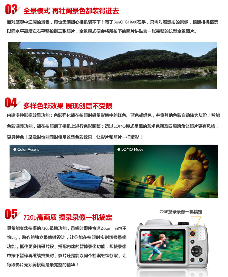 全景扫描不算一个新鲜功能,但是在国产数码相机上,暂时还无法做到日系数码相机那般精准,明基GH600所搭载的全景扫描原理仍然是通过水平拍摄三张然后合成为一张,和以往不同的是,明基GH600的全景扫描仅仅需要按一次快门,然后水平移动相机,根据相机顶部的提示,只要移动到相应的位置,相机即可自动记录……直至完成。