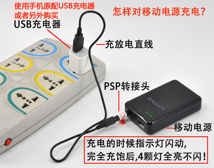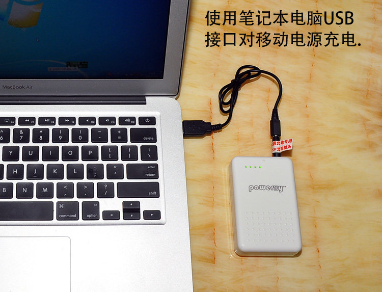 ●对移动电源充电的过程,可使用办公电脑或笔记本电脑的USB接口对移动电源充电。(注意这张照片是用笔记本来给移动电源充电)●充电过程中绿色LED闪动,完全充饱后4颗LED停长亮并停止闪动.