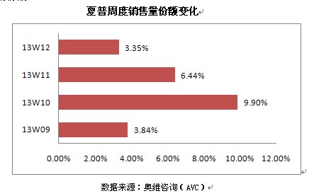 4月3日消息,日本地震、中日关系、财政危机等一系列的内忧外患,使去年以夏普为代表的日系品牌遭受重创,市场份额持续下滑,并被韩系和国内品牌抢占。而由于中国市场是夏普的重要市场,今年夏普对该市场势必要投放更多的精力,以防止其市场份额继续下滑。年后在各大品牌厂商纷纷按兵不动时,夏普展开一系列力度空前的促销活动,从夏普液晶电视“亲情回馈买1送1大尺度放送”,到“走进安徽・炫精彩”巡展合肥启动,3.15特卖会等,时间由开始的1月初到现在,促销活动周期在不断的拉长。据奥维咨询(AVC)周度(13W10)监测数据显示,夏普液晶销量份额快速上升至9.9%,环比上涨237.54%,在当周国内零售量排名上升至第四,销售额份额为16.53%,环比上涨290.13%。由于夏普在尺寸结构上的优势,当周国内零售额排名更是跃居第二,促销效果明显,销售一路飘红。但在随后的两周销售回冷,据最新周度监测数据(13W12)显示,夏普液晶市场份额仅为3.35%,环比下降77.13%,排名滑至第九。促销活动周期的拉长并没有带来与之相应的市场份额。