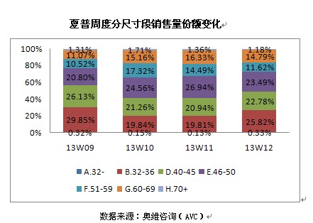 众所周知,去年大尺寸的成长性已经优于其他尺寸,并且各大彩电厂商不断推陈出新,大尺寸现已跻身为市场主流产品。此次夏普促销顺应市场需求把46英寸以上大尺寸作为促销重点。据周度(13W10)监测数据显示,夏普46英寸以上尺寸份额都有很大的增幅,尤其是以51-59英寸,环比增长了456.06%。而接下来的两周尺寸结构趋于稳定。
