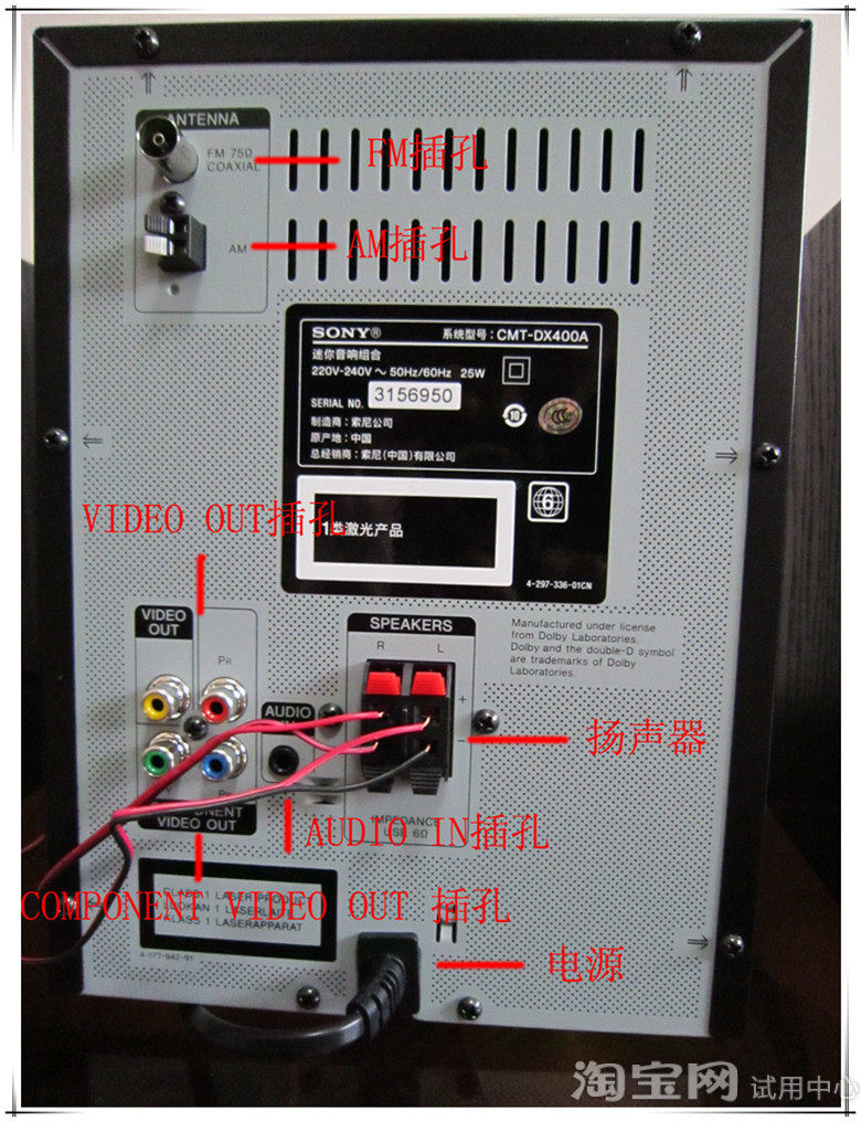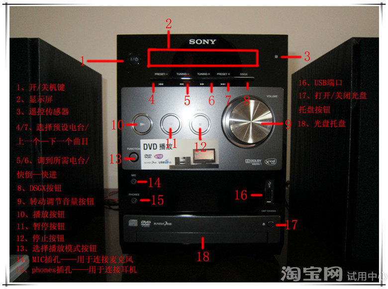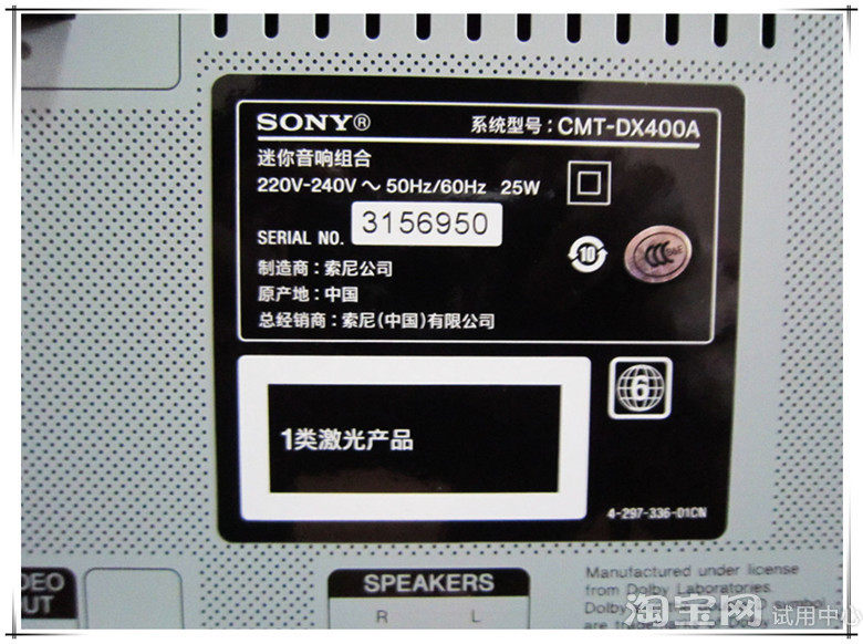 上面一层介绍后,主角就登场了!三个用塑料布包裹号了的音响扬声器的拍摄调整了光照效果,黑色的海面包裹着整个扬声器喇叭,这样的拍摄可以让各位更清楚的看到扬声器内在的喇叭!扬声器背后的标示。注明了产地、品牌、经销商、编号以及扬声器的电阻值、类型等~内容很详细。一般的音响连接起来都是以插头的形式、这款音响 采用的是铜丝、黑红两种线的颜色也在音响后进行的卡位的标示!不用担心会连接错线!标配附带的防滑小垫,防止扬声器放置在光滑的桌面上产生滑动!安装方式非常简便、从黏贴纸上撕下粘贴到扬声器底座下就可以了!扬声器的外观采用的是木质的材质。其优点是声音具有更强的穿透性、同时也能够增加不少音响的美感!好了,下面来看下音响主机的正面介绍吧!按钮挺多的,上面的图片已经把所有正面的按钮介绍内容全部描述出来了!相信可以帮助到有意购买这款音响的消费者,对这款音响有个细致的了解!音响的背部插孔描述这是音响主机背部的标示。显示屏的一张特写图USB插槽,用U盘也可以在这款音响上播放音乐。其操作过程是删掉U盘根目录的所有文件及文件夹,然后在根目录上放置自己喜欢的歌曲、音乐。开机以后按选择播放模式的按钮来调整到USB播放模式即可。光盘的托盘