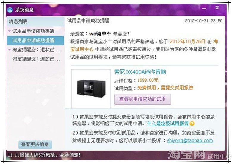 感谢淘宝小二对我的认可!感谢店家提供这一次的试用活动!