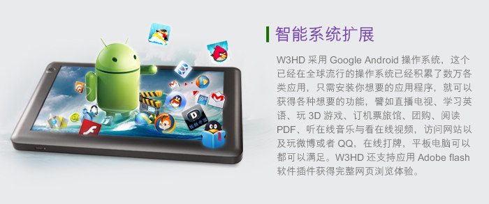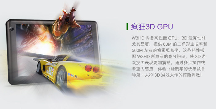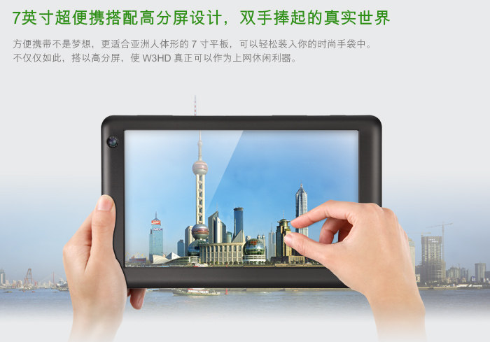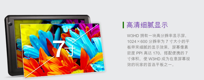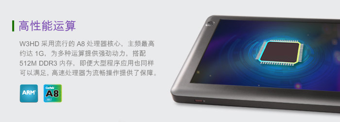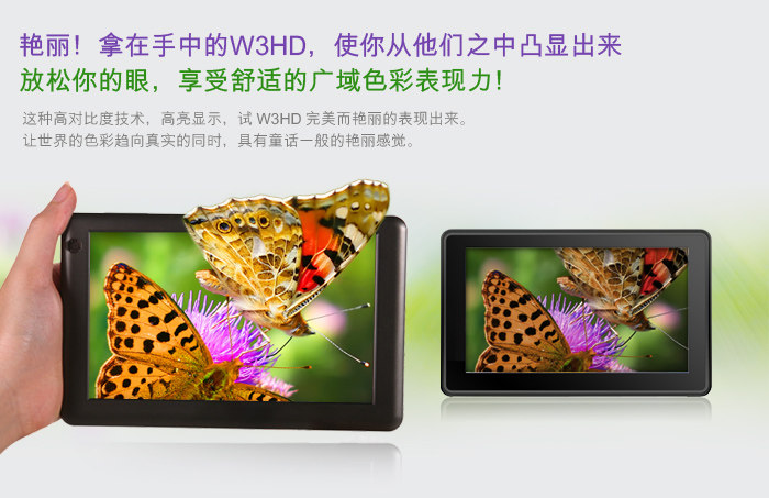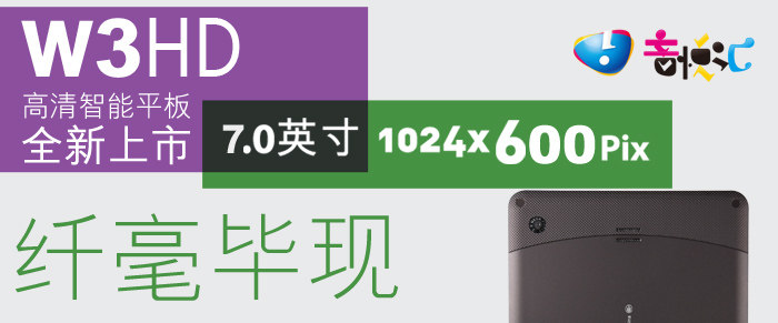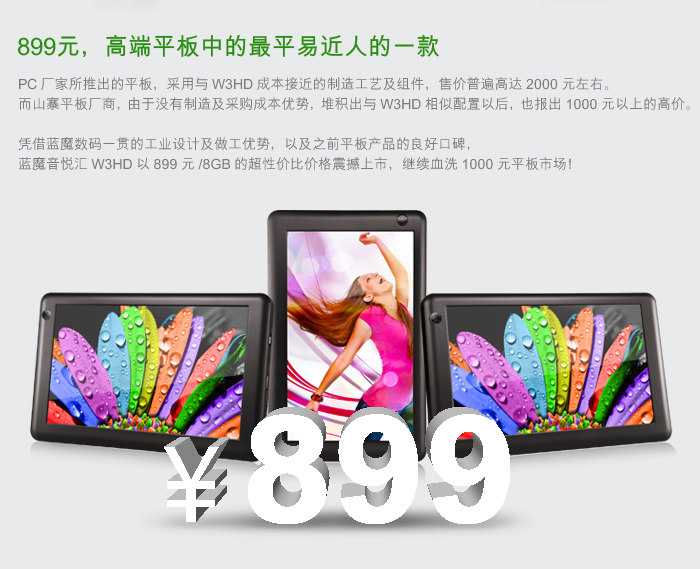 蓝魔最近新推出一款W3HD的7吋平板,屏幕采用了 Anti-glare 防眩光技术涂层,分辨率为1024×600。搭载了A8处理器、512MB DDR3内存,前置30万像素,后置200万像素双摄像头设计,内置8G存储,支持1080P高清播放,目前报价899元。这款新品具体表现如何? 我们将在接下来详细测试一下这款新品。 外观设计醒目